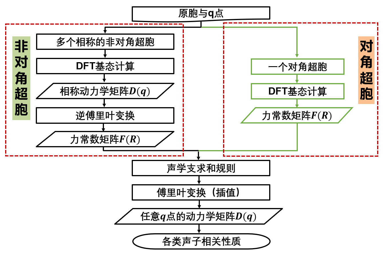 此时将产生多个非对角超胞文件夹(SUPERCELL.*),每个文件夹对应一个不同的非对角超胞结构。接下来的步骤与对角超胞法相同:使用第一性原理计算软件计算各超胞位移结构的力,然后进行后处理求解声子性质。