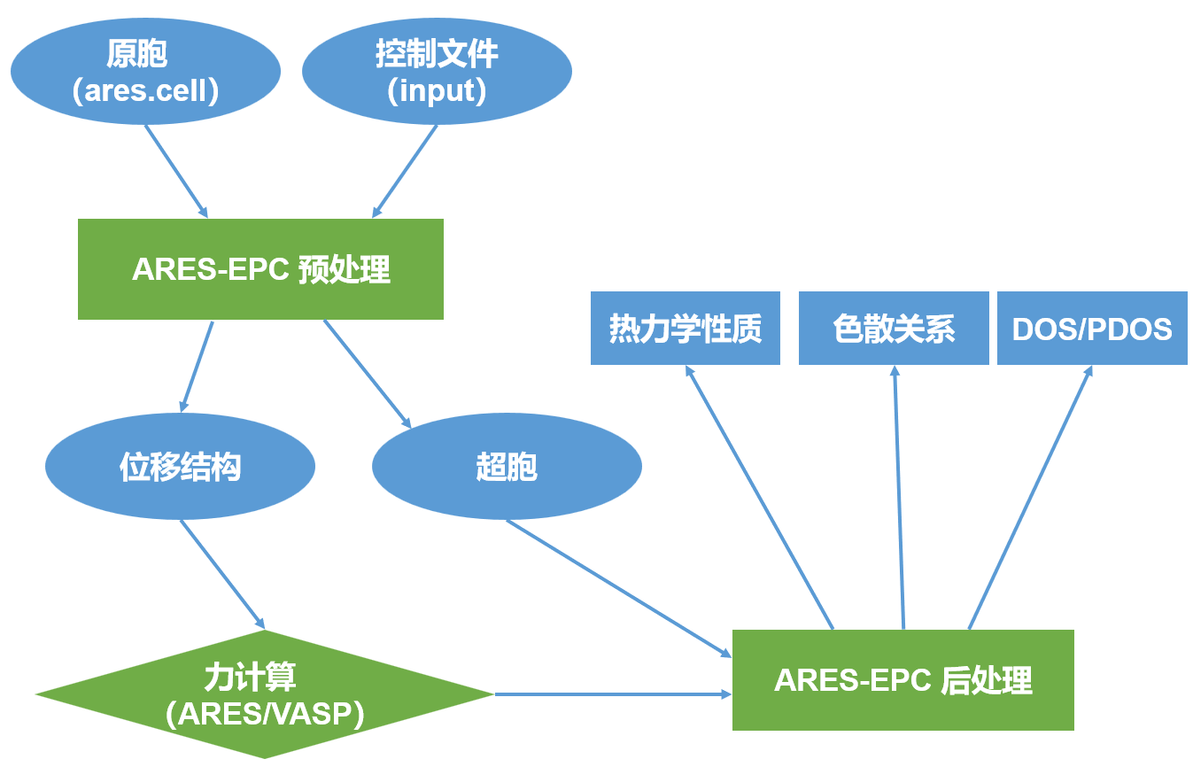 运行第一性原理计算软件(例如 ares)计算各超胞位移结构的力。在计算完所有位移结构受力后,便可以进行后处理,求解声子性质。