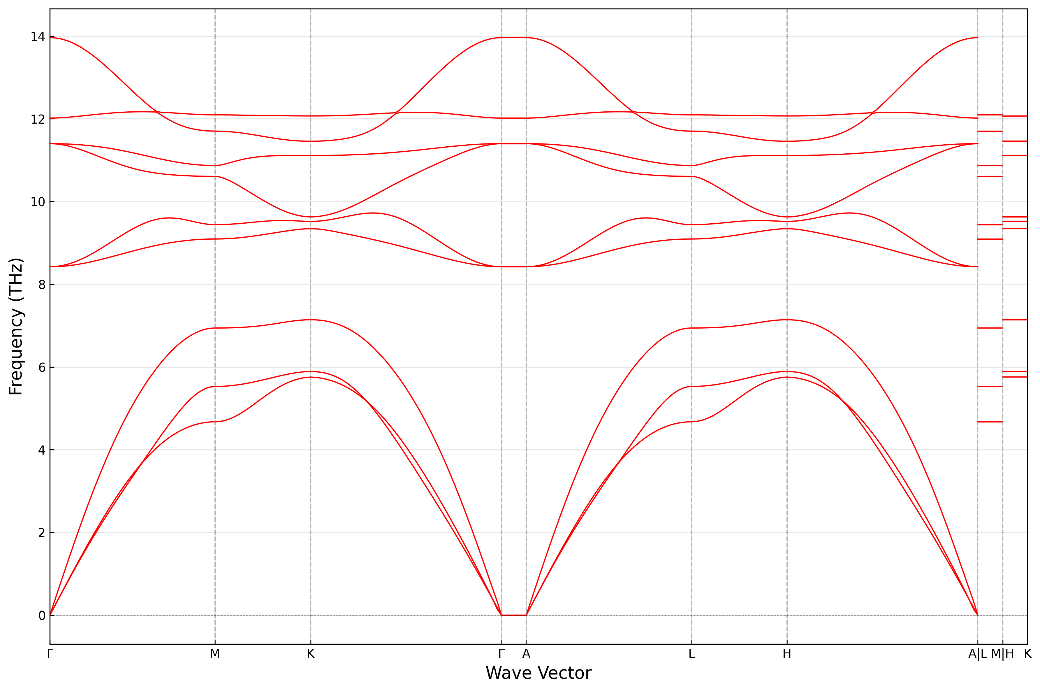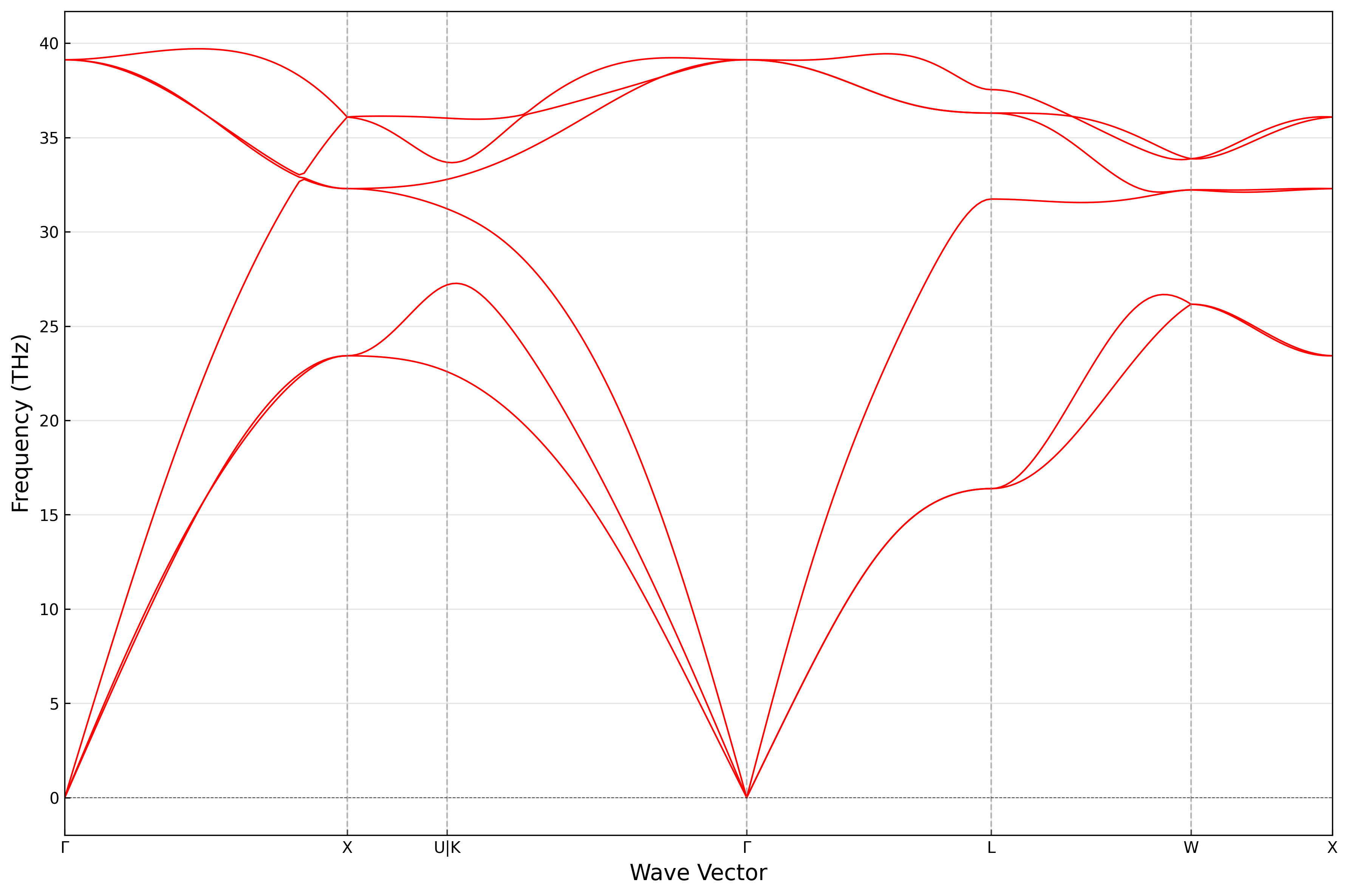其中,PHONON_SPECTRUM文件包含声子色散关系数据,THERMAL_PROPERTIES文件包含声子热力学性质数据。 调用ARES-EPC/utils/plot_phonon_spectrum.py脚本绘制声子色散关系: